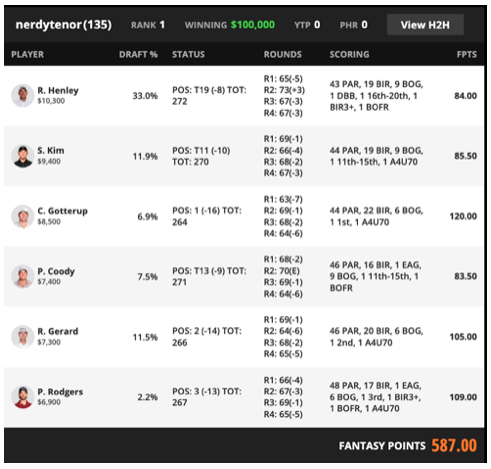 To win a large-field contest, you have to be on the nuts, and getting the 1-2-3 on the leaderboard while they combine for under 20% ownership is the perfect way to do it. Neither of his other three golfers finished inside the top 10 either, but steady top 20s with a lot of birdies did the trick. What I find most interesting, though, is not a specific lineup breakdown; when a player of this high volume is a big winner, I enjoy deep-diving their portfolio from the week. Nerdy maxed the $25, $555, and $3,180, the three contests with $100K top prizes, and below are his top-owned golfers.
