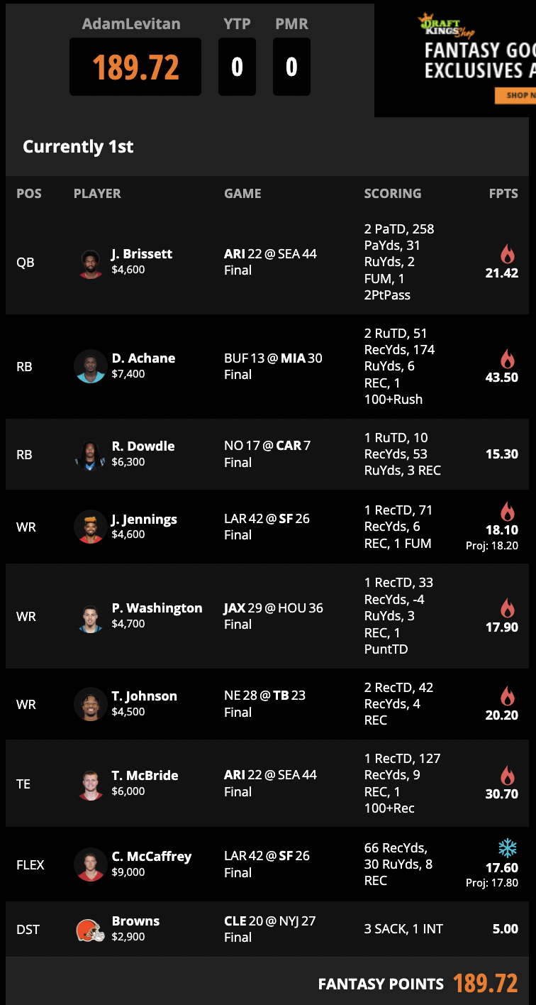 Week 10 DraftKings: 189.72 points, won 86.4% of head-to-heads