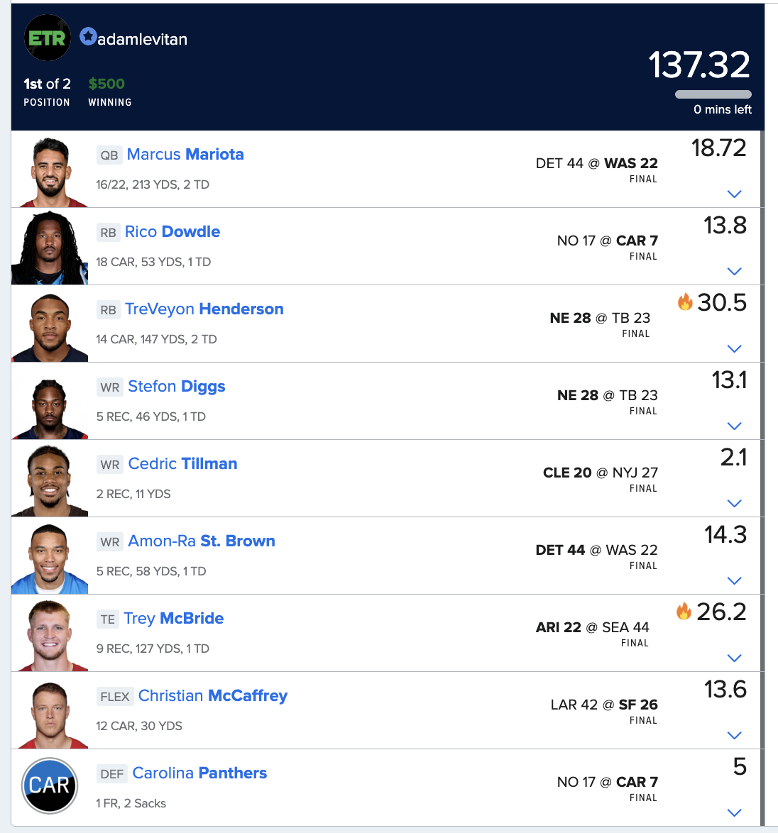 Week 10 FanDuel: 137.32 points, won 58.8% of head-to-heads