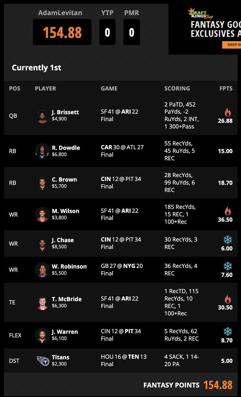 Week 11 DraftKings: 154.88 points, won 75.7% of head-to-heads