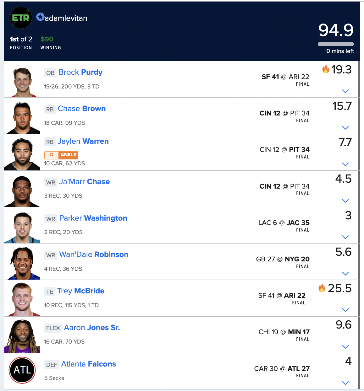 I think I got pretty fortunate here. Rico Dowdle really struggled and Ja’Marr Chase got absolutely smoked by Christian McCaffrey. But the conviction on Jacoby Brissett over JJ McCarthy made a huge difference. And then getting a 15-185-0 from Michael Wilson is obviously absurd. The sun-run in cash continues.