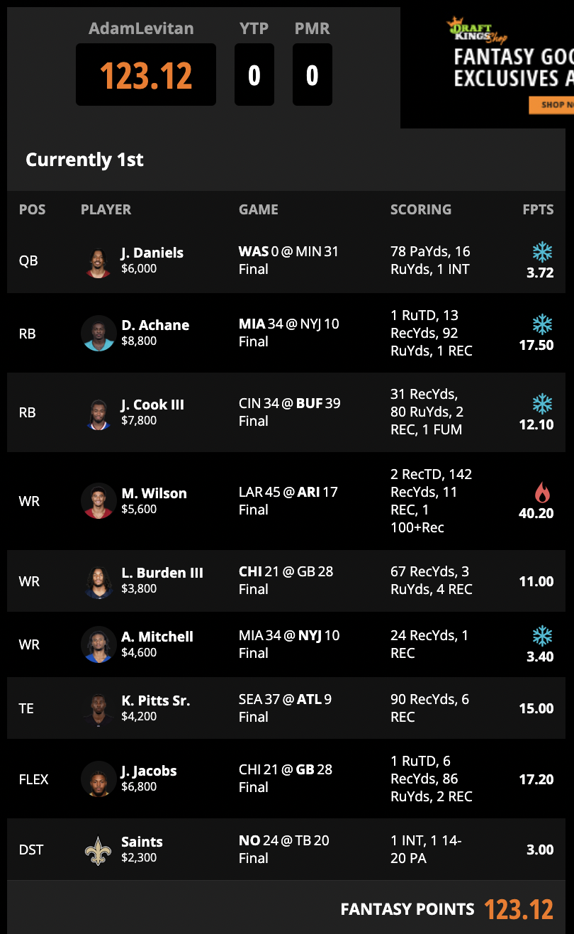 Week 14 DraftKings: 123.12, won 28.0% of head-to-heads