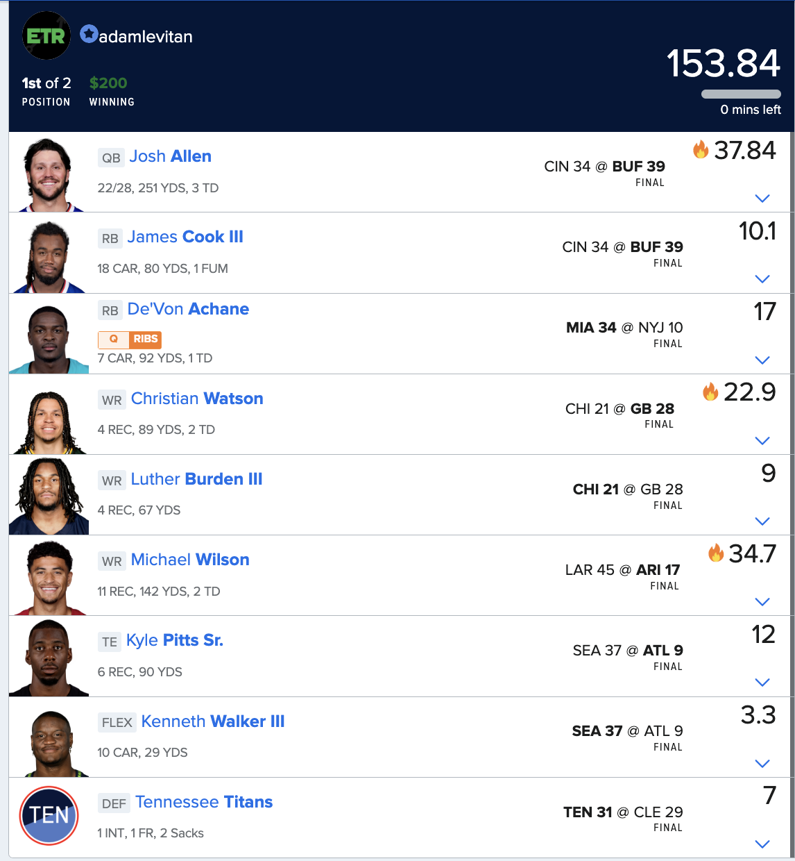 I’ve run very pure on injuries in cash so far this season, so I shouldn’t complain. But I still will. De’Von Achane was going for 50 if he didn’t get hurt, Jayden Daniels missed all of garbage time against the Vikings, and the Jets had to turn to “Brady Cook” after Tyrod Taylor went down. On FanDuel, I thought Kenneth Walker vs. RJ Harvey was a true coinflip… and I lost that by 15.7 points.