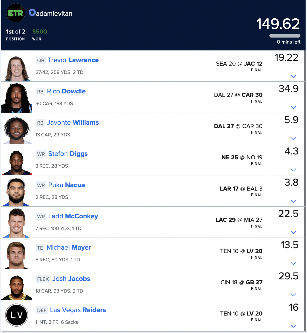 Certainly got unlucky that Puka Nacua (ankle) went down, that’s a huge salary to eat an injury at. So I was thrilled to escape with another solidly winning week. Really happy with the way I handled tight end. And given the way the usage went, think some version of the DK team I played was right. Note that this team was our optimal (based on our projections pre-lock). You can always find our optimals if you have an ETR In-Season Product subscription and The Solver add-on.