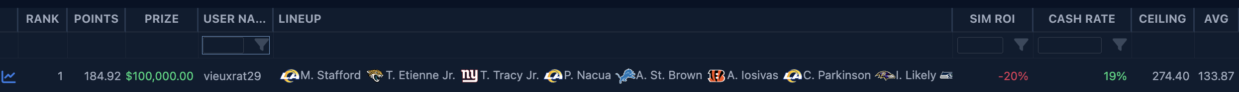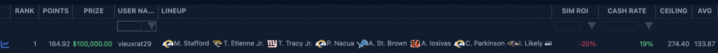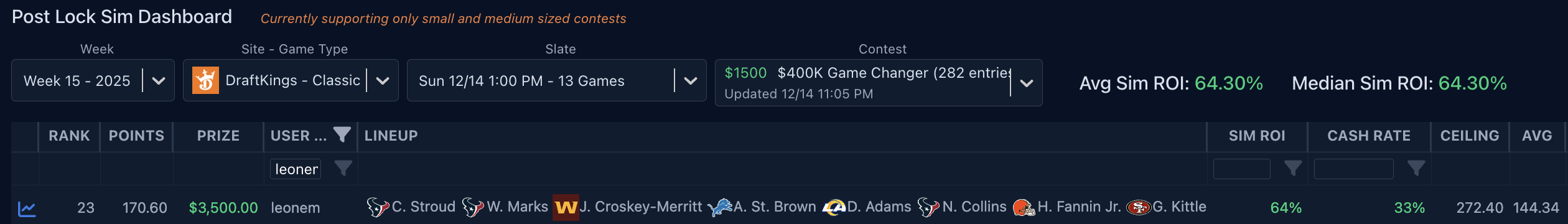 Going back to the Week 15 Game Changer, since I posted my team above that simulated well and managed a decent cash, we see the winner of the contest actually had a team that simulated poorly on average (-20% ROI):