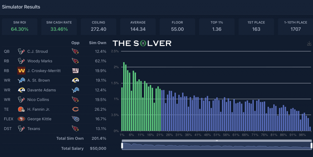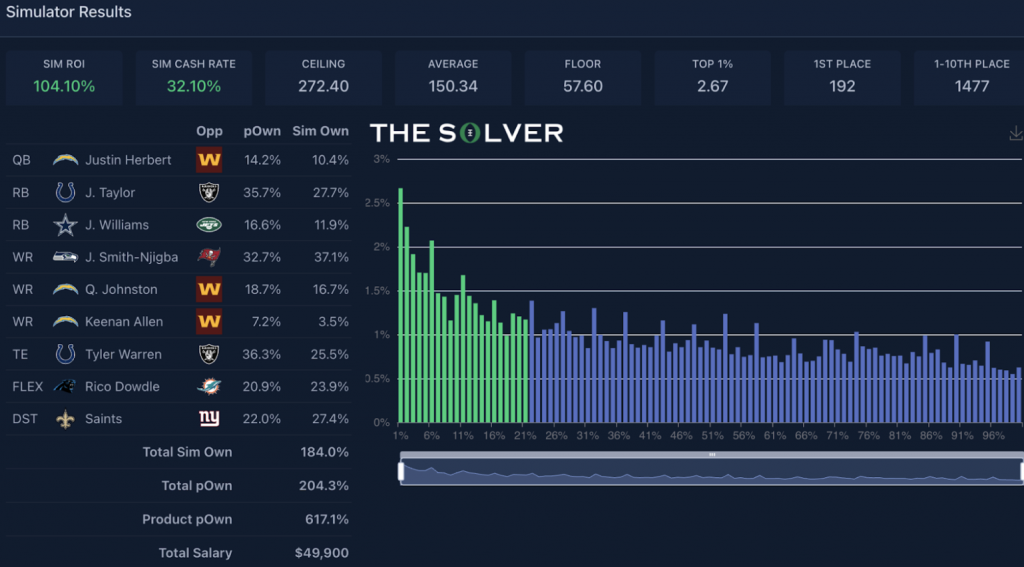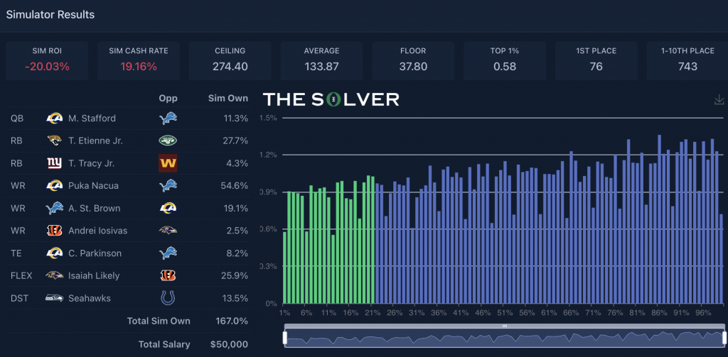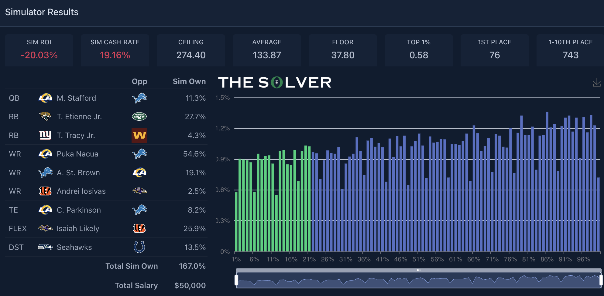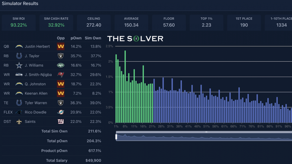 Last NFL season, we unveiled our Post-Lock NFL DFS contest sims over at The Solver. The Solver takes ETR’s same aforementioned NFL game simulations each week and combines them with the actual lineups played in a variety of DFS contests on DraftKings. Like with the pre-lock Solver sims, in addition to the actual standings of the contest, the post-lock sims show how often we expect each actual lineup to win, cash, place in the top 10, etc. The number that draws the most attention is the Sim ROI, a single number that depicts a lineup’s average return on investment over all of our sim iterations based on total prizes won and total entry fees.