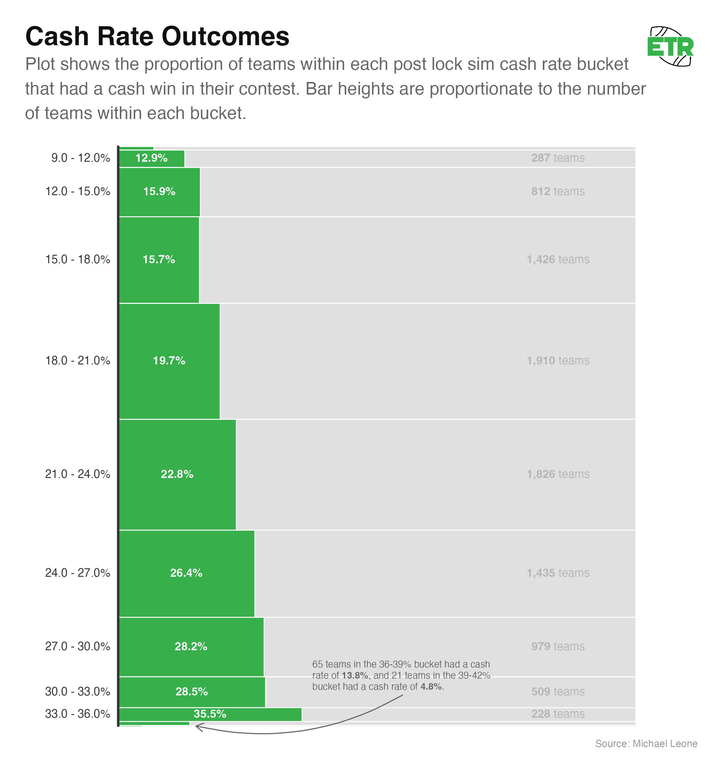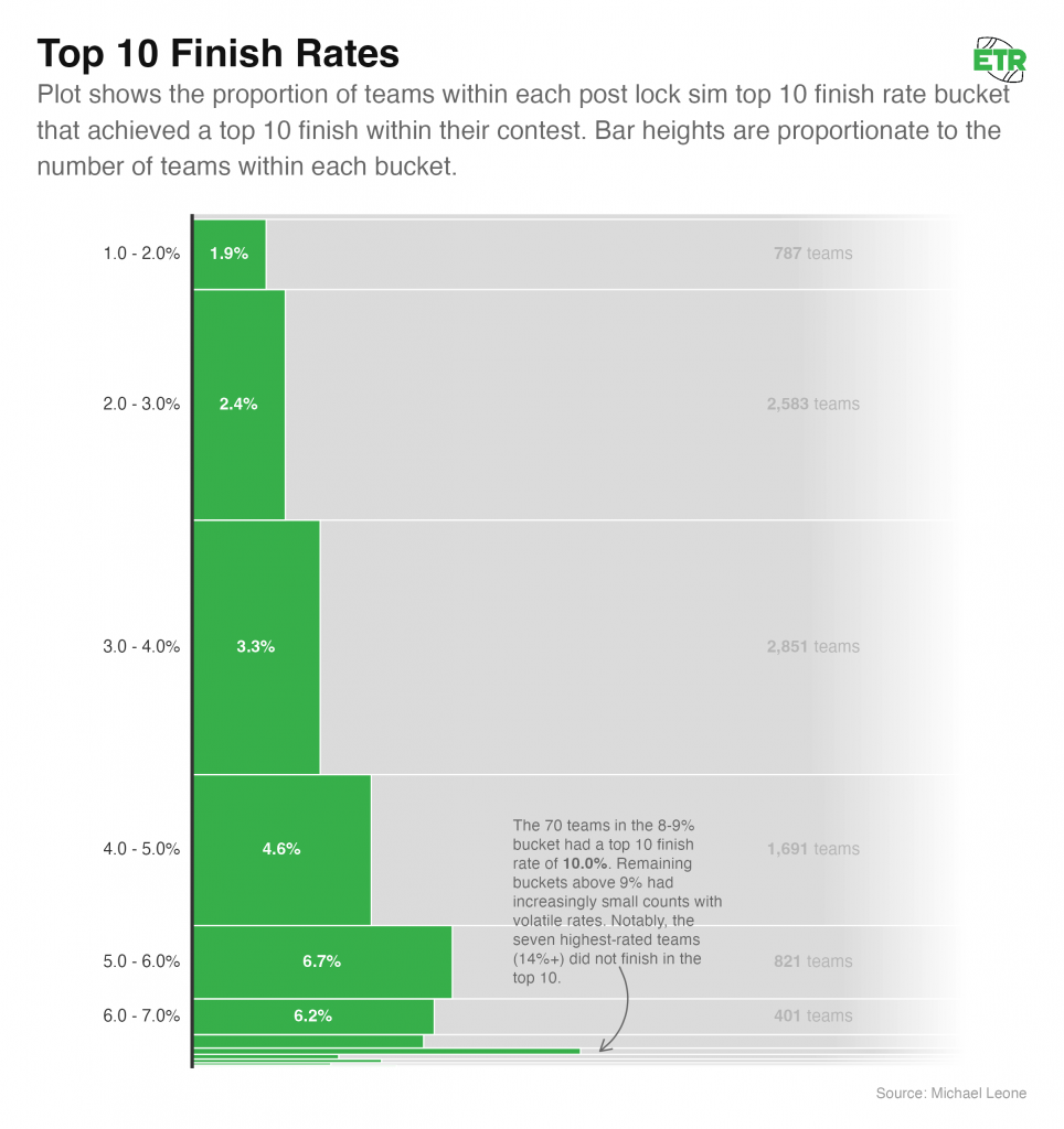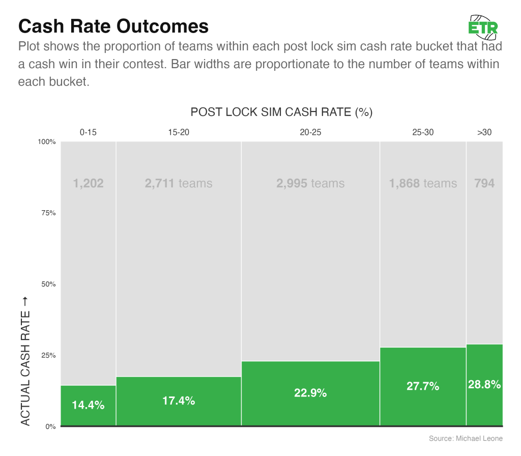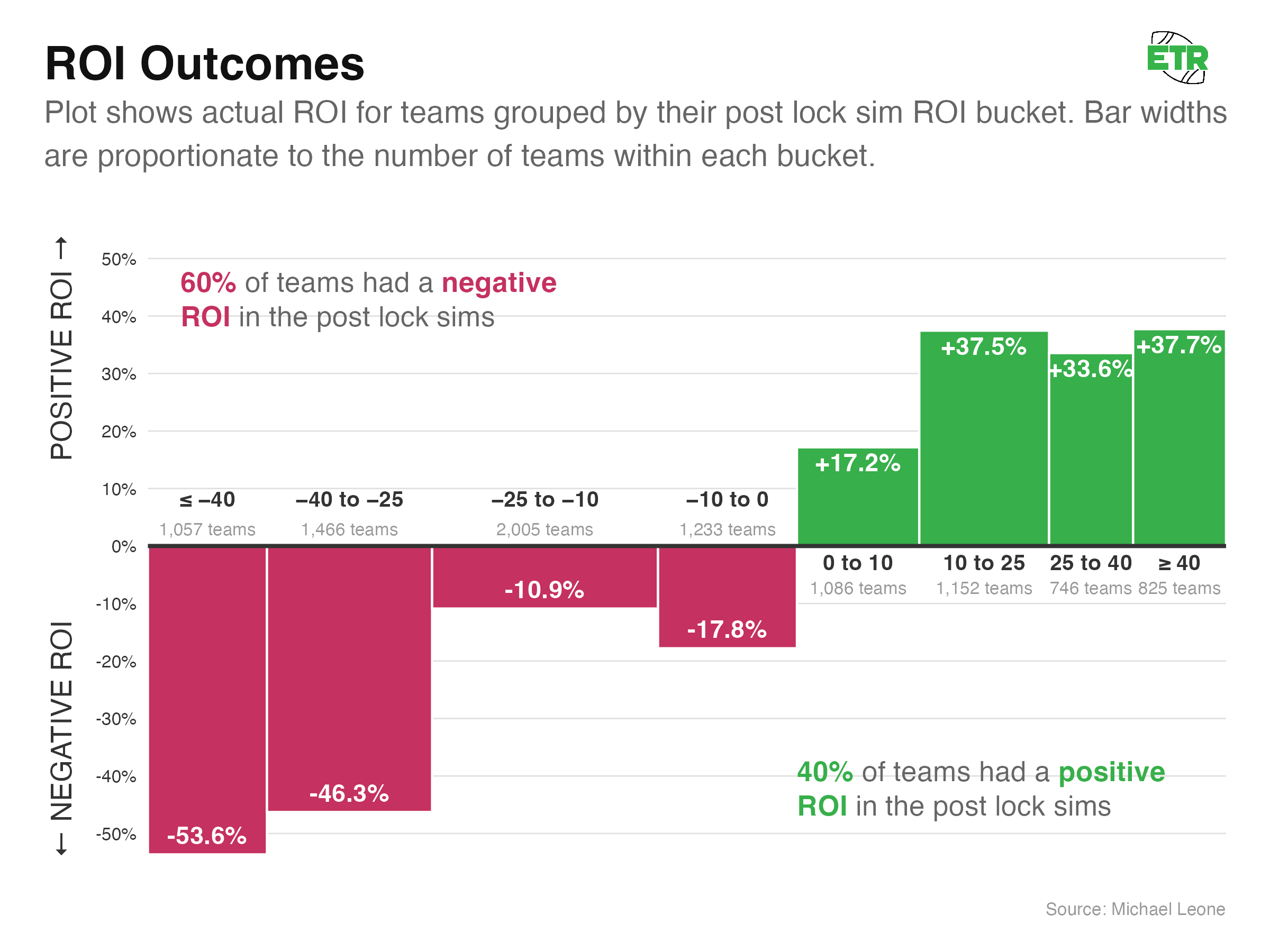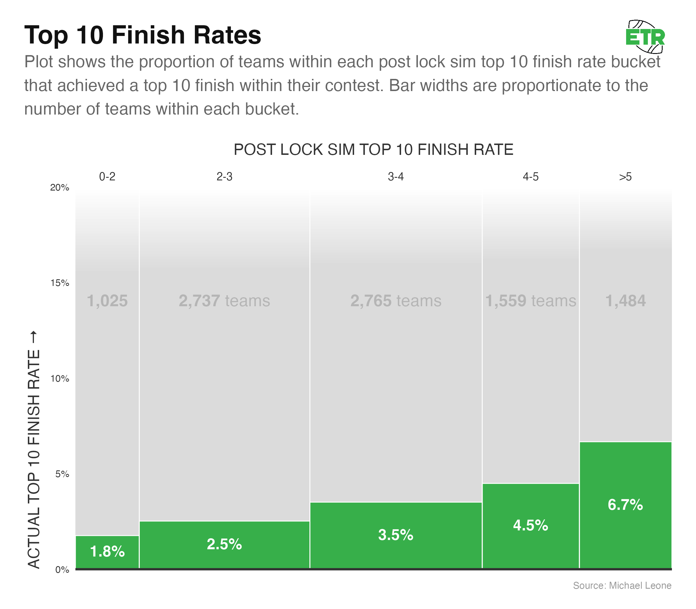 People often complain or excuse their lineups simulating negatively post-lock because “of course my team didn’t sim well in ETR post-lock, ETR had X player for only Y points, which was obviously wrong.” If this is consistently happening to you, you’re probably going to lose over the long run. We know the ETR sims are pretty well calibrated and good at identifying bad teams. Now, if you’re able to spot the correct side of the ETR projection miss at a very high rate, this might not be true. But most people are going to be closer to 50/50 on this.