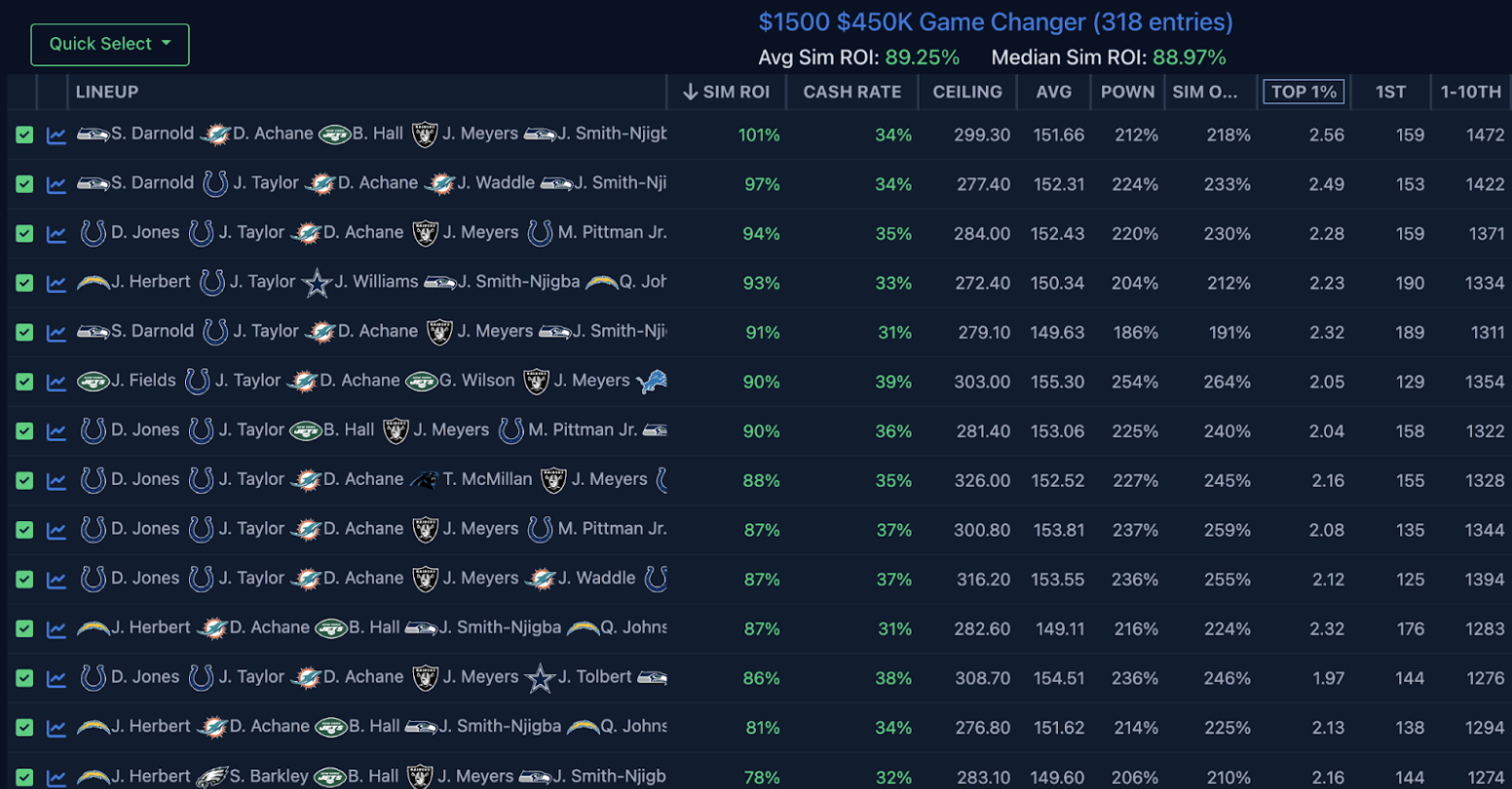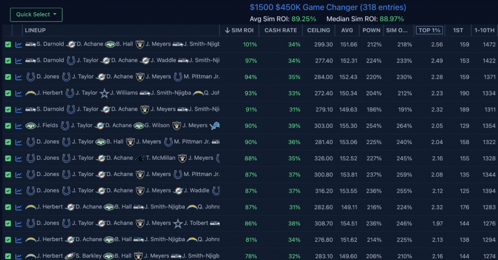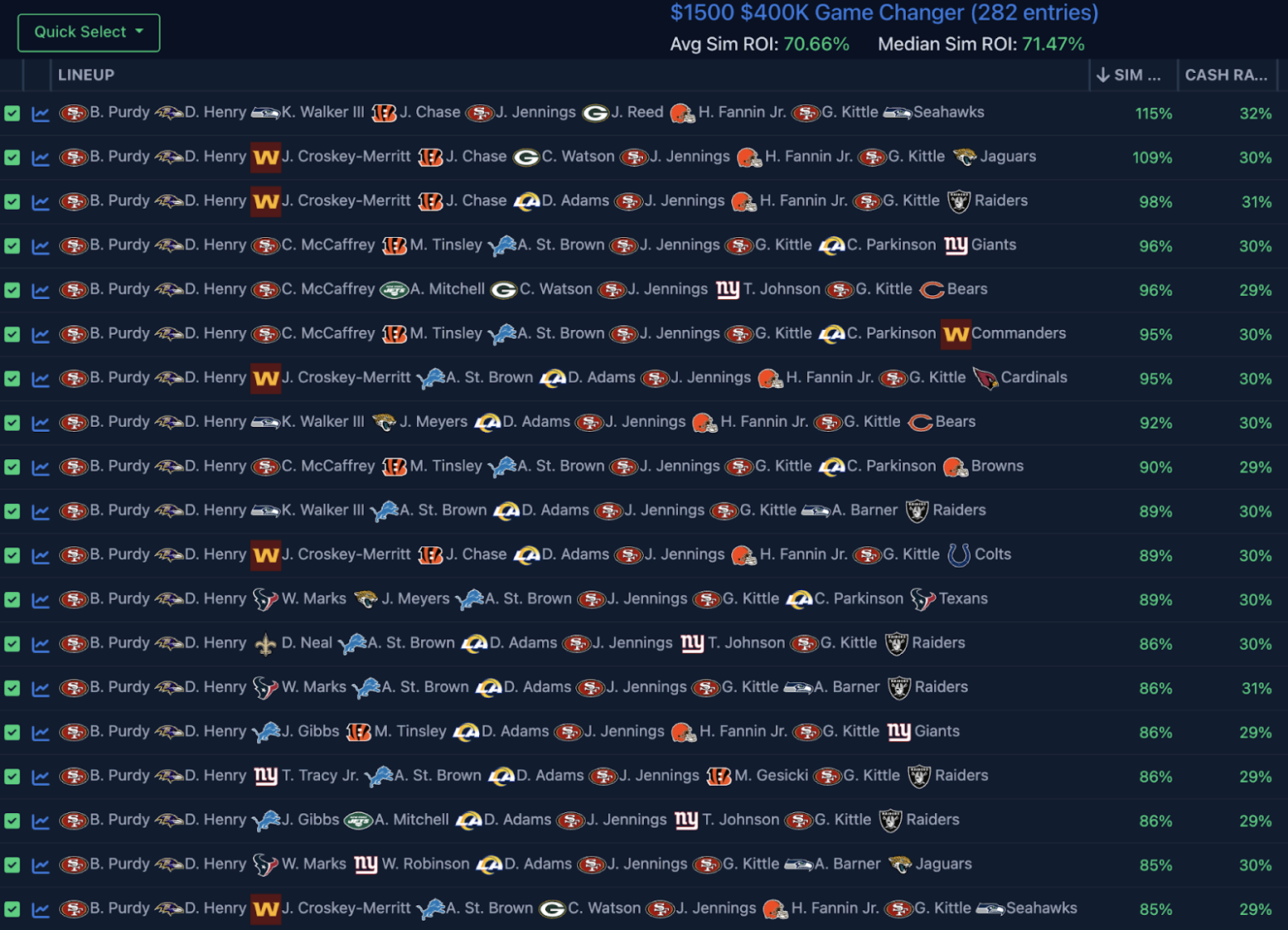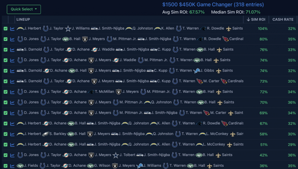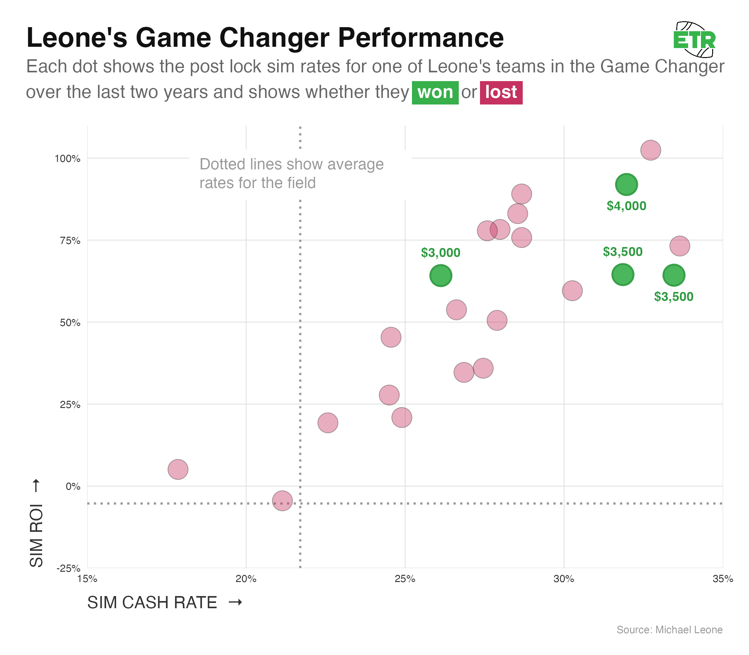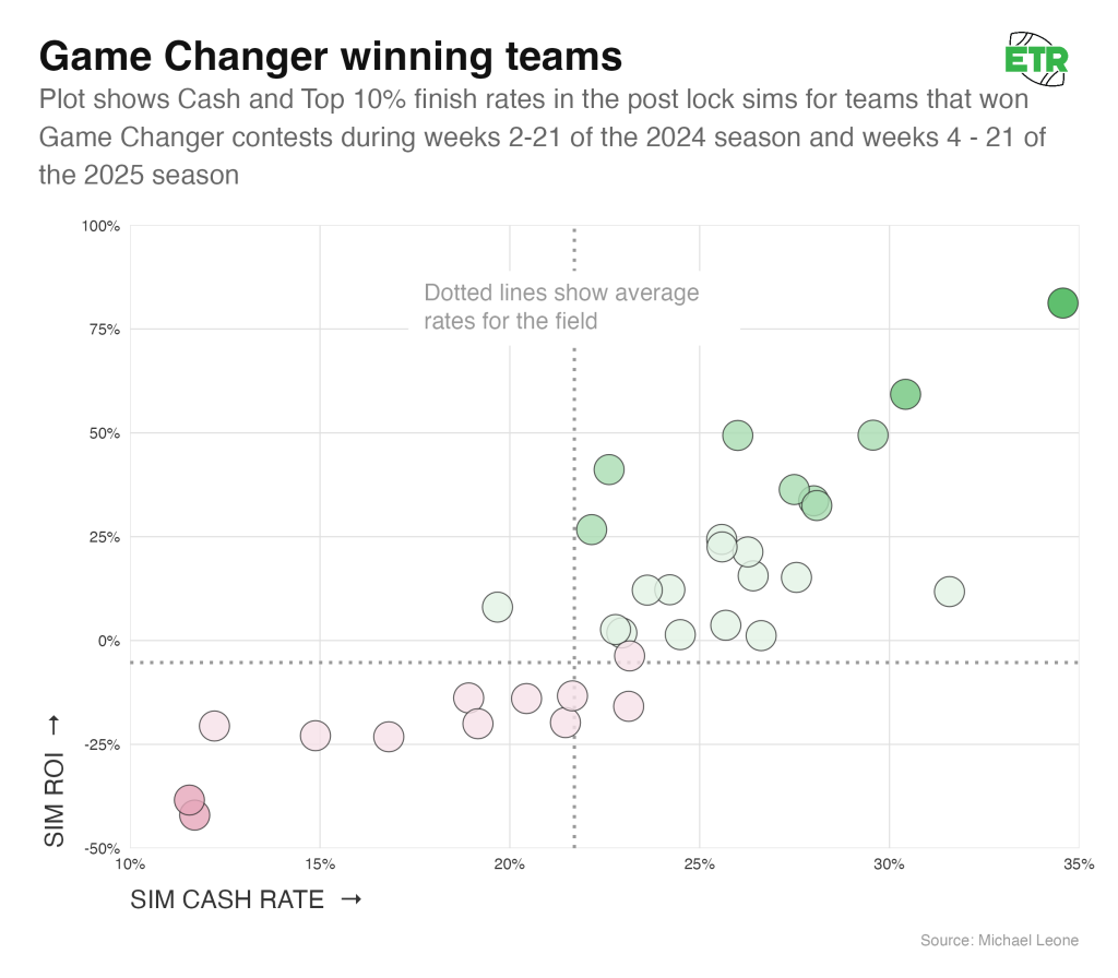 We don’t get to play the entire collection of 10+% simulated ROI teams in the Game Changer each week. We’re limited to one entry per week. It’s more nuanced and challenging to win at DFS than simply pumping out well-simulating teams and collecting our money.