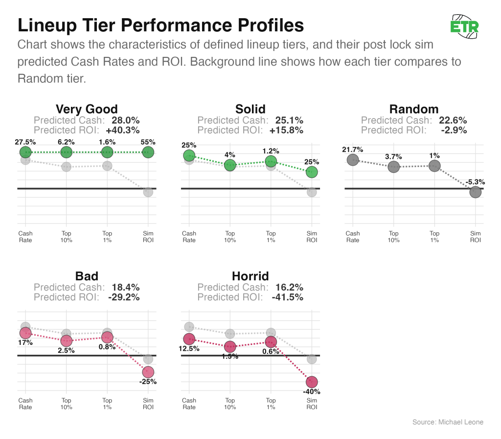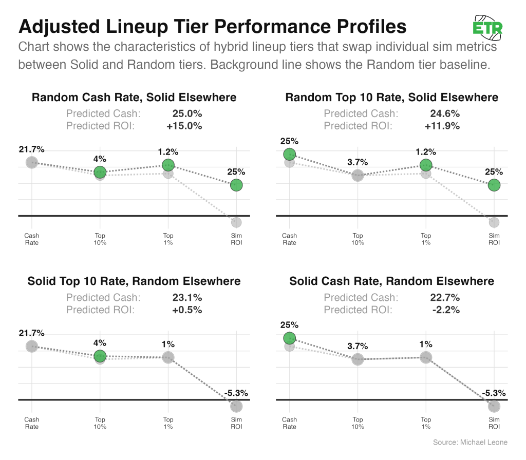 I hope the above information is helpful to grasp realistic bankroll expectations and to truly understand how variant this game is, even when playing good lineups. I suspect most people who are reading this and using ETR Solver sims are playing something most akin to the “Solid” lineup above.