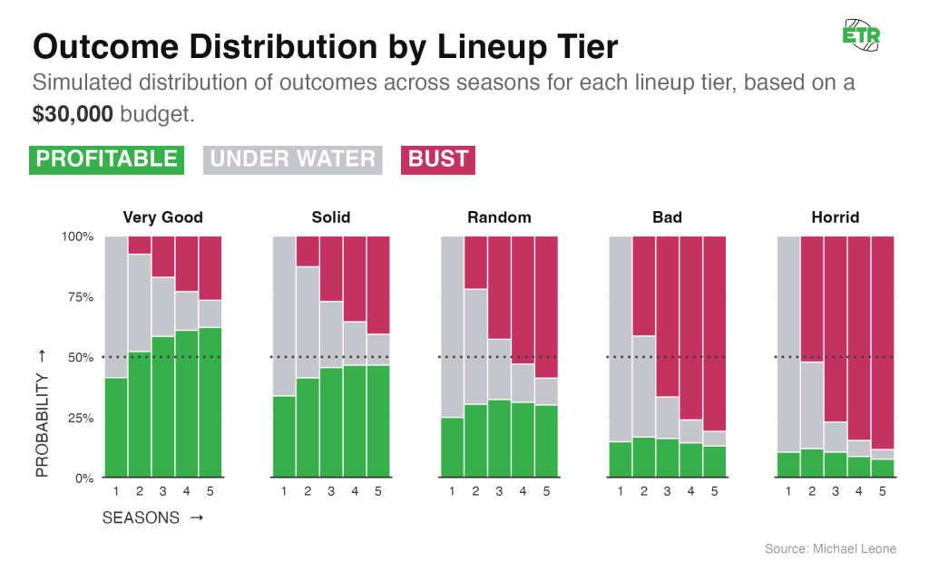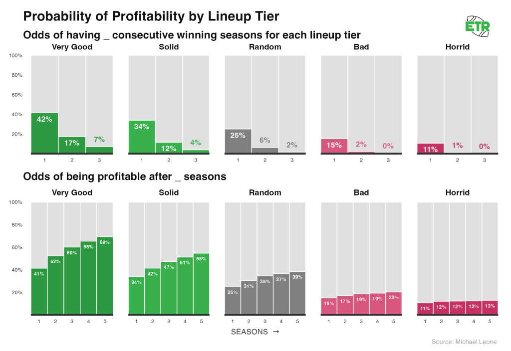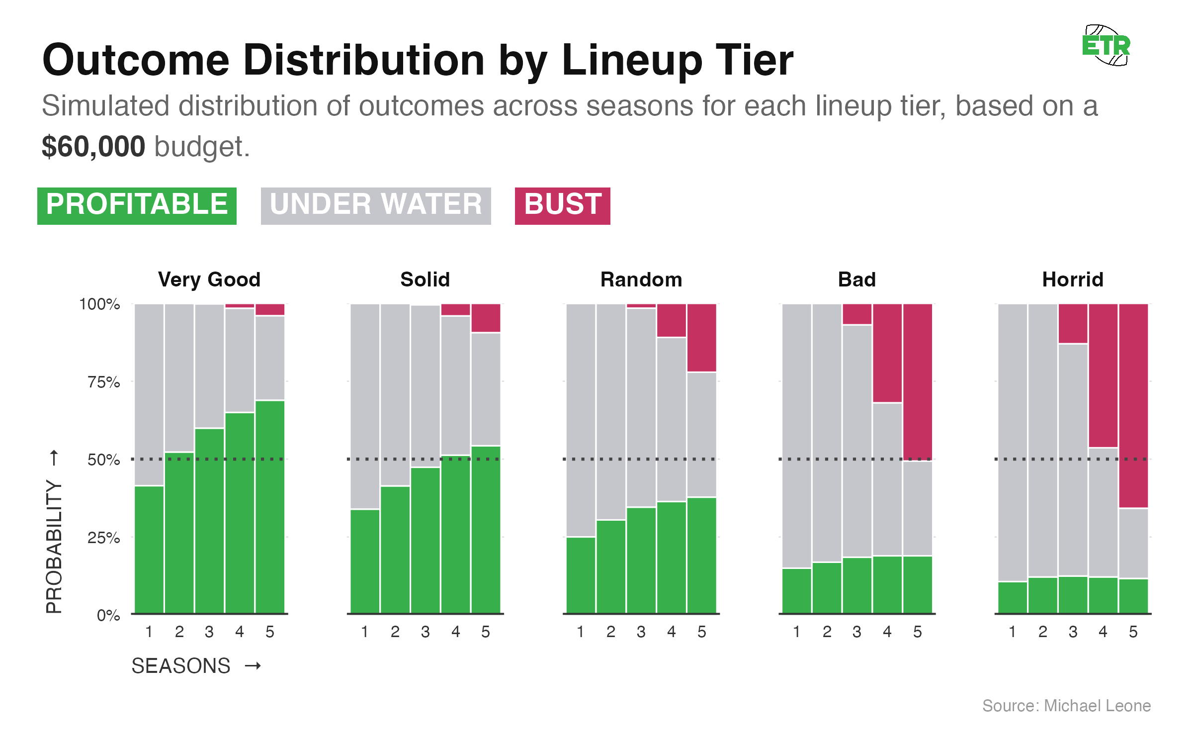 • For all lineups, the odds of being profitable over X seasons are reduced once you assume that the lineup stops being played when the initial bankroll is gone. For example, earlier in this section, we saw that a “Very Good” lineup had a 69.4% chance of being profitable after five seasons. That drops to 62.2% when you remove the outcomes where the lineup busted (lost the initial $30,000 bankroll) and then went on to become profitable if you were to keep playing anyways.