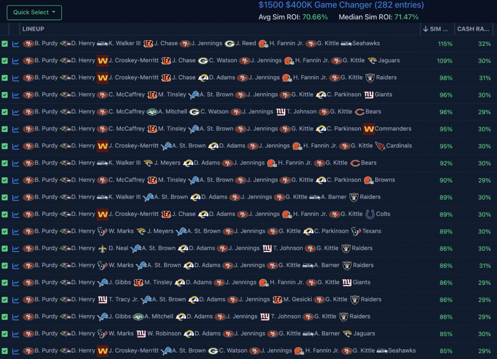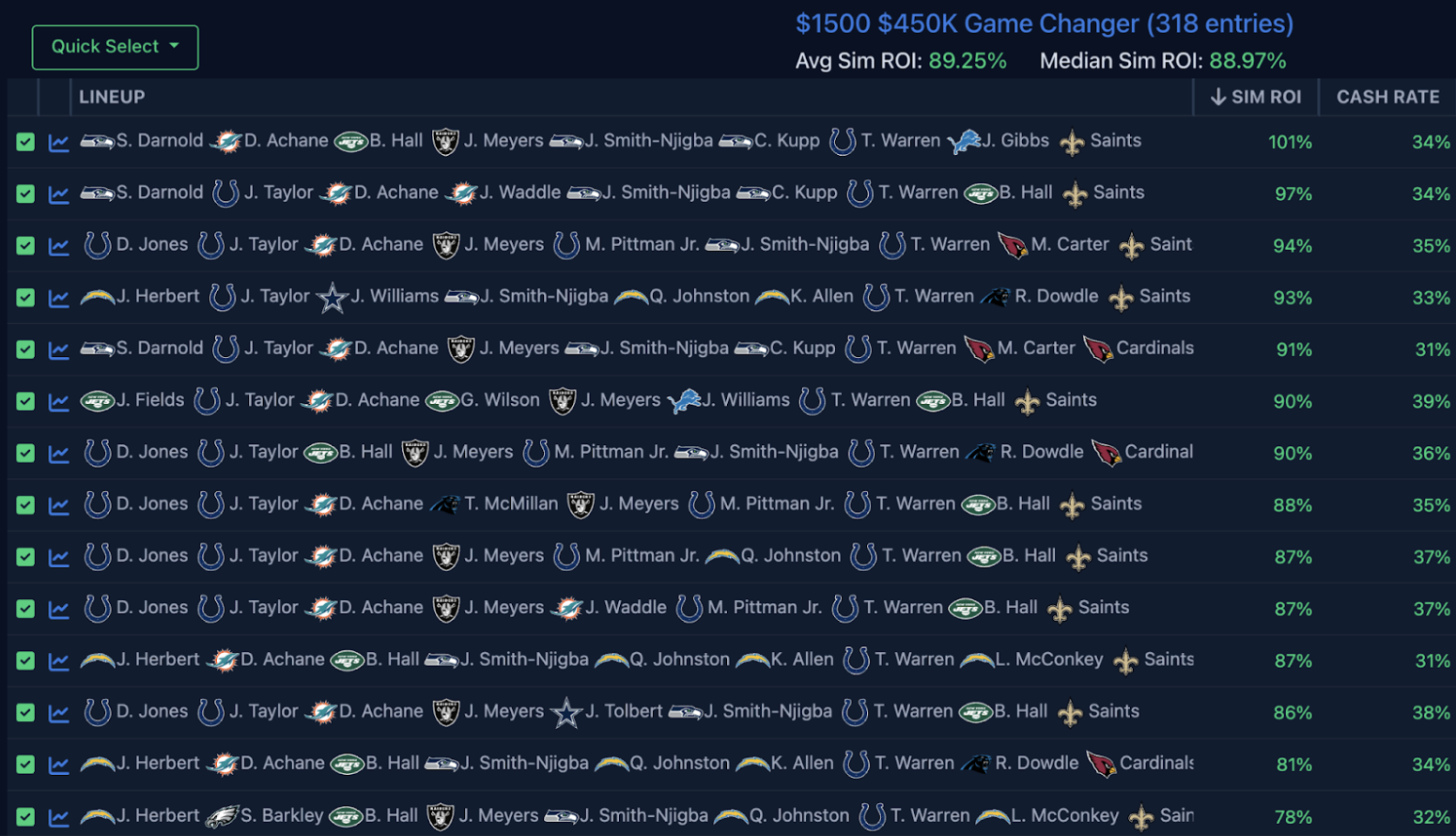 As an example, here are 14 test lineups I saved from Week 5 of this past season that simulated the best in the Game Changer pre-lock: