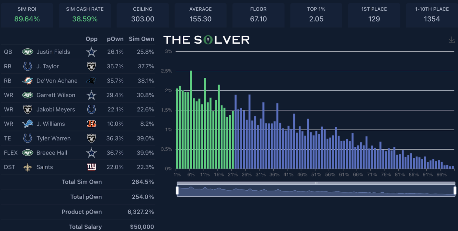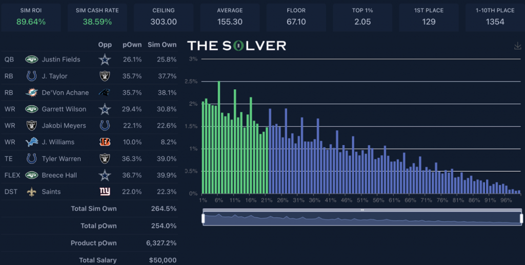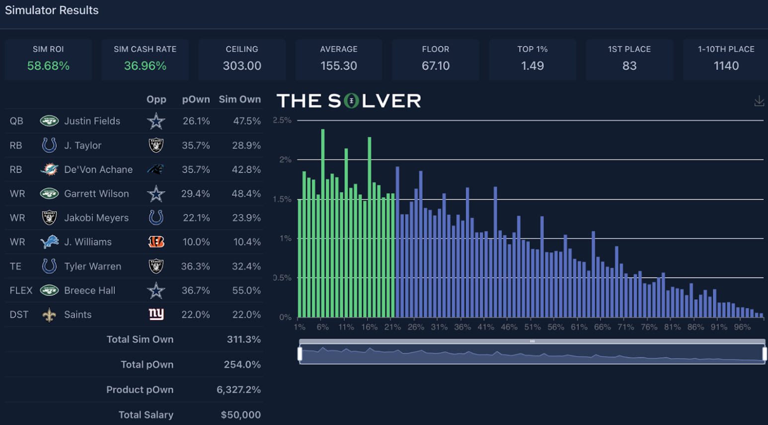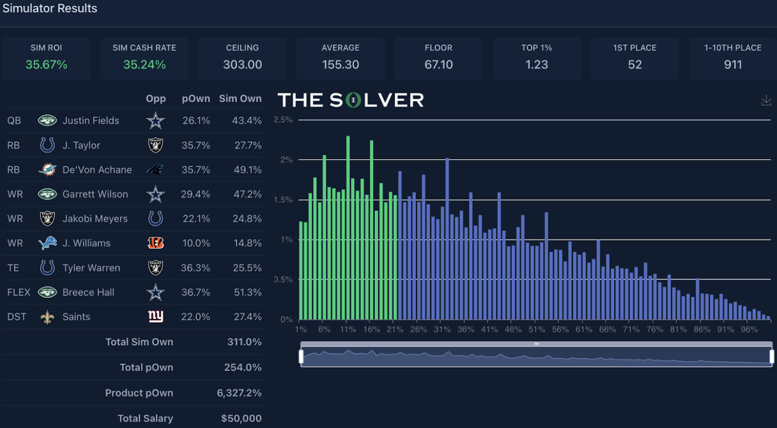 The Solver has added the ability to boost or dock simulated ownerships, so pre-lock you can test how changes in ownership may affect the simulated ROIs of lineups. In the Justin Fields lineup above, I went back to Week 5 and boosted the ownership of Fields-Wilson-Breece in the Jets stack along with some other pieces to get it more in line with how ownership actually turned out. You can see that even pre-lock, the ROI dipped when doing so: