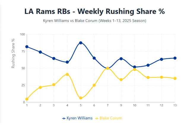 From Weeks 1-6, Williams averaged a 72% rushing share to Corum’s 20%; since then, Corum has cut the gap to a 58/39 split. Yet Williams continues to be given lines like the 16.5 attempts we saw this week.