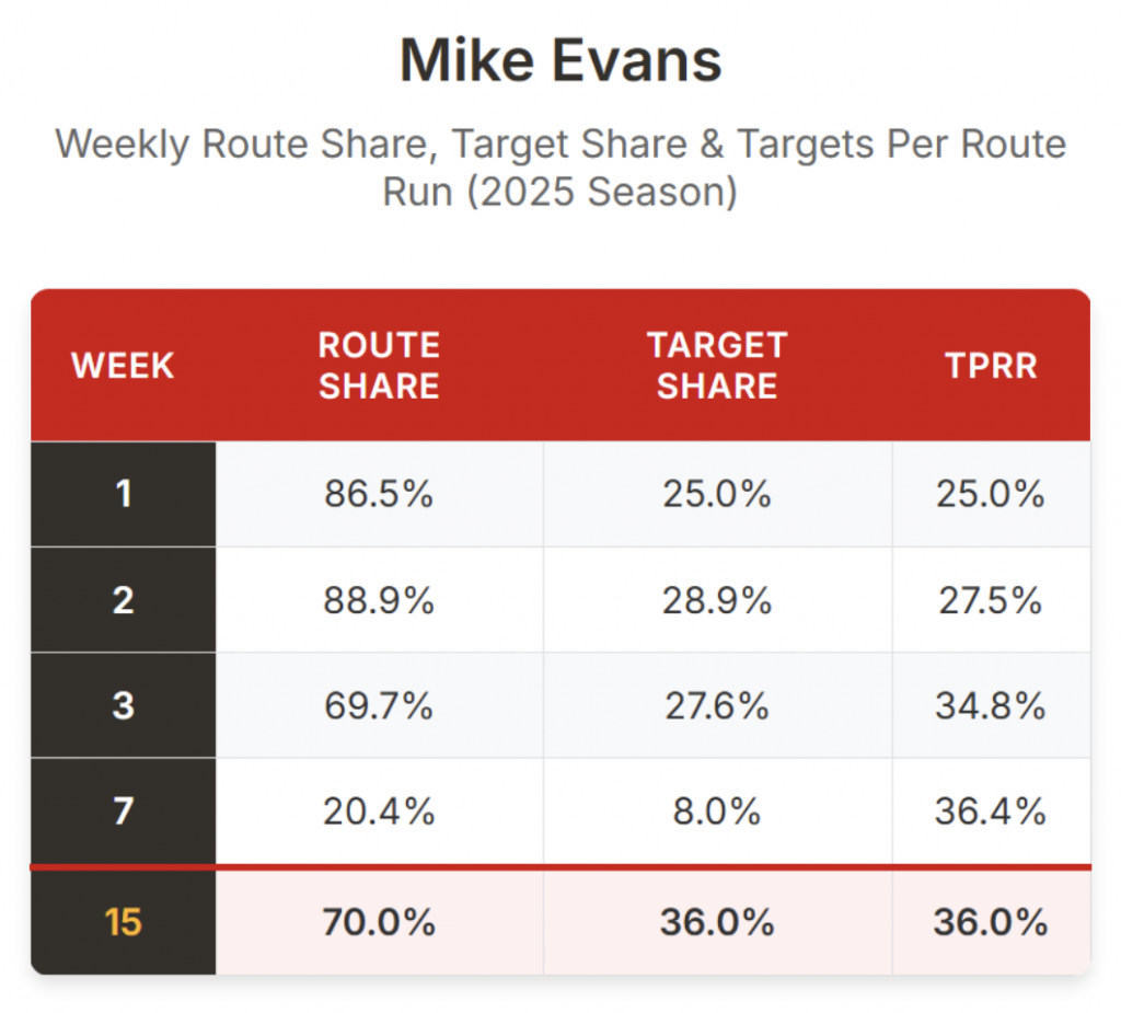 Evans did not quite play a full game (70% routes), but that didn’t stop the Bucs from feeding him by far his biggest target share of the year at 36%.