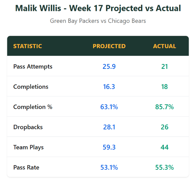 The Packers ran just 44 plays and passed barely above a 50% clip, but Willis remained on an absolute heater. Not only did he complete a league-best 86% of passes this week, but he did so while throwing the highest average depth of target (12.4 yards) among all QBs.