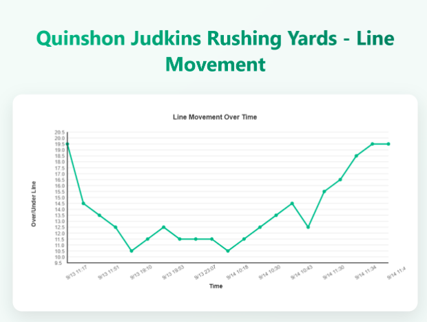 The first bump came when NFL Network’s Ian Rapoport reported Sunday morning that the rookie would get 10-15% of snaps in his debut. Then the real surge came when a Browns beat reporter claimed Judkins would actually get the start, at which point the line was bet all the way back up to the original 19.5. We adjusted our 11.7 projection to 18.9, but it would have required a leap of faith to go much higher.
