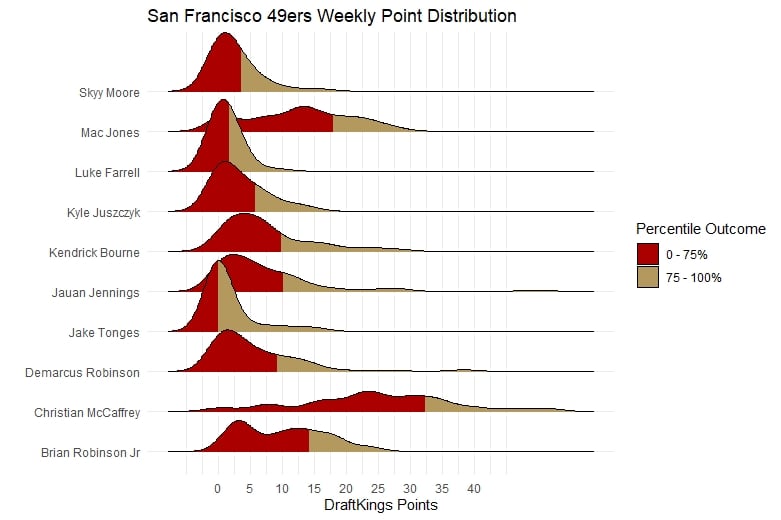 Cowboys at 49ers ($46800) (205.5%): Captain George Kittle, Christian McCaffrey, Tony Pollard, Brock Purdy, 49ers, Jordan Mason – (2)