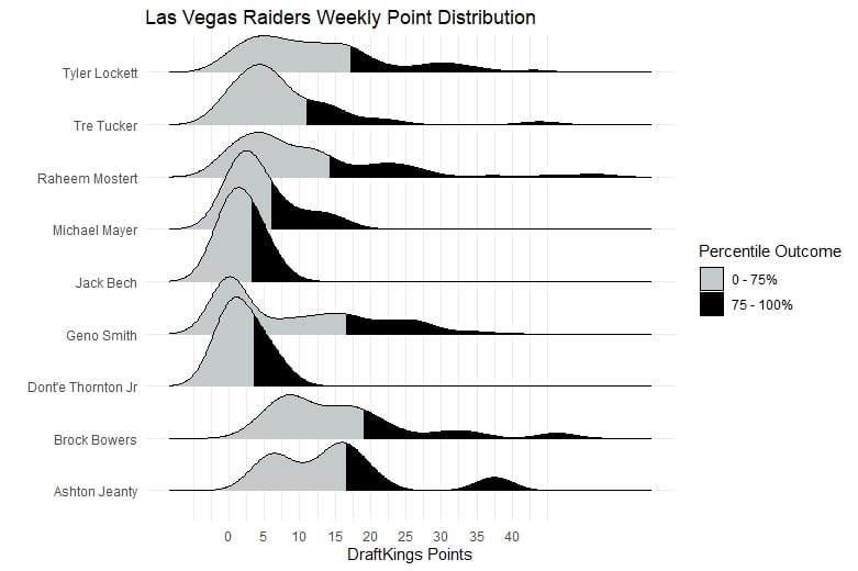 Broncos at Raiders ($49000) (240.32%): Captain Josh Jacobs, Emmanuel Sanders, Courtland Sutton, Tyrell Williams, Darren Waller, Brandon McManus – (1)