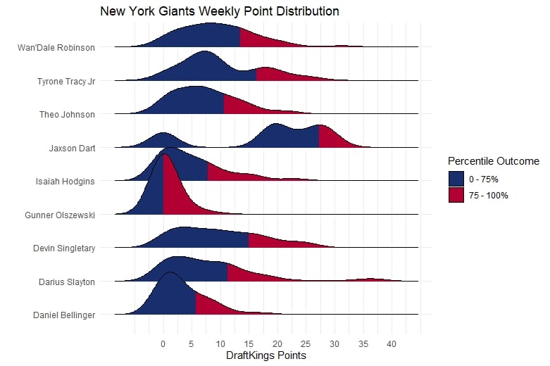 Giants at Bills ($47500) (182.1%): Captain Stefon Diggs, Josh Allen, Saquon Barkley, Wan’Dale Robinson, Deonte Harty, Quintin Morris – (2)