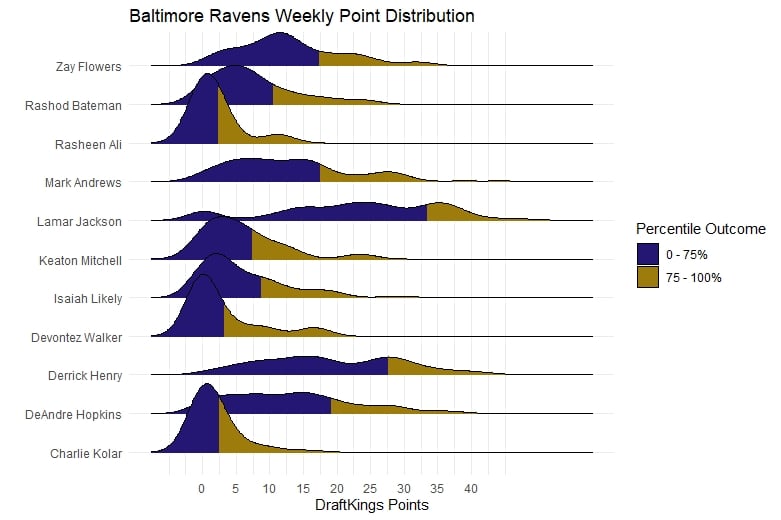 Ravens at Rams ($49800) (196.98%): Captain Lamar Jackson, Mark Ingram II, Marquise Brown, Robert Woods, Willie Snead IV, Tyler Higbee – (15)