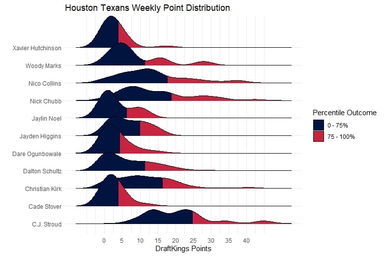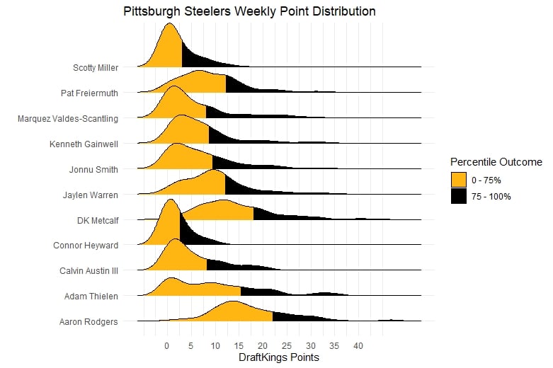 Wild Card Weekend wraps up in primetime Monday night, as the Texans travel to Pittsburgh to take on the Steelers as 3-point road favorites in a game featuring a derisory 38-point total. Houston wrapped up the regular season with the league’s 10th-highest PROE (-0.2%), posting a -3.1% mark over their final four games and boasting a 60.5% overall pass rate that checks in at 55% in neutral situations and dips to 50% when playing with a lead. Facing a middling Steelers defense that ranks 18th in EPA/Pass (+0.03) and 22nd in EPA/Rush (-0.01) while defending the league’s eighth-highest situation-neutral pass rate (60%), I’d expect a similar run/pass split for Houston Monday night. Pittsburgh’s offense isn’t far behind in season-long PROE (-1.0%), going slightly more pass-heavy in recent weeks, ranking seventh over their last four games (+0.7%), with a 60.2% overall pass rate that holds steady at 59% in neutral situations and jumps modestly to 65% when trailing. Houston’s defense has been among the league leaders in most categories all season, but they’ve been particularly punishing against opposing aerial attacks, ranking first in EPA/Pass (-0.19) compared to just 11th in EPA/Rush (-0.05). I wouldn’t be surprised to see a slightly more run-centric game plan from Arthur Smith and Co., as they try to find the path of least resistance against this Houston defense.