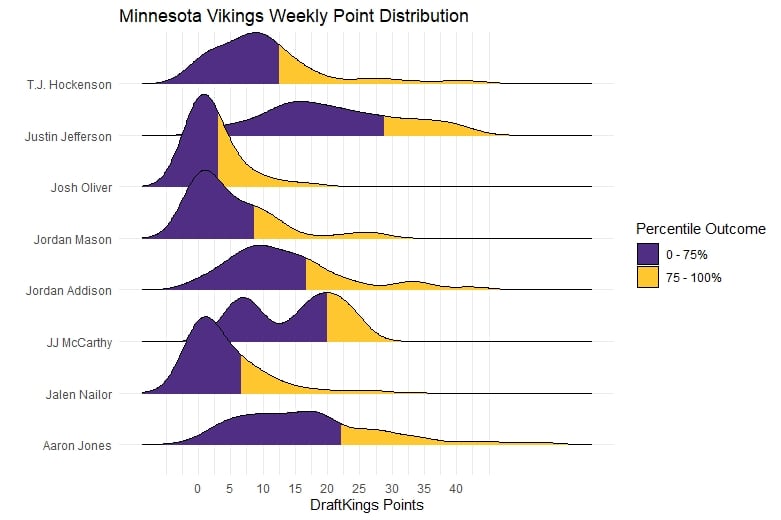 Vikings at Eagles ($49800) (236.3%): Captain D’Andre Swift, Justin Jefferson, Kirk Cousins, DeVonta Smith, T.J. Hockenson, Jordan Addison – (340)
