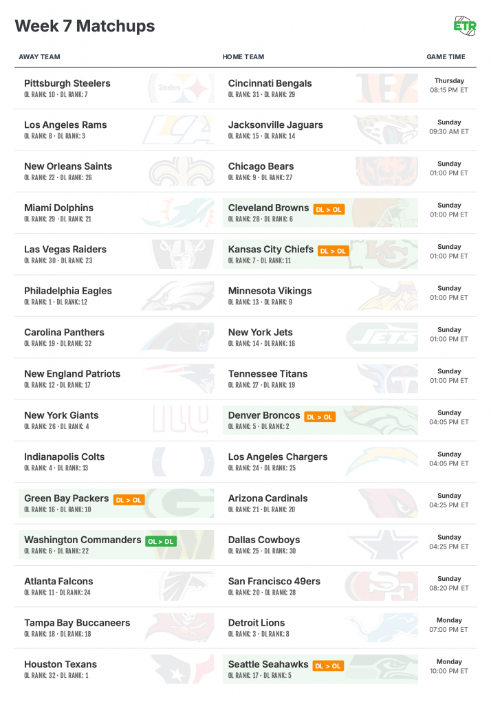 With that in mind, below you’ll find the biggest mismatches between defensive and offensive lines for Week 7. The objective is to project QB pressure through film study, injuries, scheme, coaching, and talent.