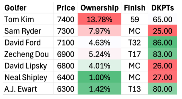 It was a more middling result this past week for the Value Report with zero top 10s on the week. However, we did have three golfers land in the top 20 for DraftKings points in the event. It was highlighted by David Ford, who, despite being T32, had the most DraftKings points of the bunch with his epic Thursday round, highlighted by back-to-back eagles. That was good enough for 14th on the slate, which again emphasizes the thought process of prioritizing scoring over just raw finishing points when it comes to DFS. Zecheng “Marty” Dou looked to be in fringe contention before opening poorly on Sunday, but his rally left him with a steady week at still minimal ownership, while A.J. Ewart really paid off on the bottom end. Ewart entered Sunday tied for sixth, and with his prolific college résumé, I expected him to thrive in contention, but being his first time in this spot on the PGA Tour, the nerves got the best of him. All three scored well enough to be in winning lineups on the week, but it was quite the stiff competition for value plays rising to the top at the Cognizant. On the poor side, Tom Kim had an awesome round Friday to rally for a made cut, but he didn’t do much on the weekend and came in quite higher owned than anticipated. The trio of Sam Ryder, David Lipsky, and Neal Shipley missed the cut by a combined four strokes, but overall, it was weak outings from each, especially Lipsky and his birdie rate.