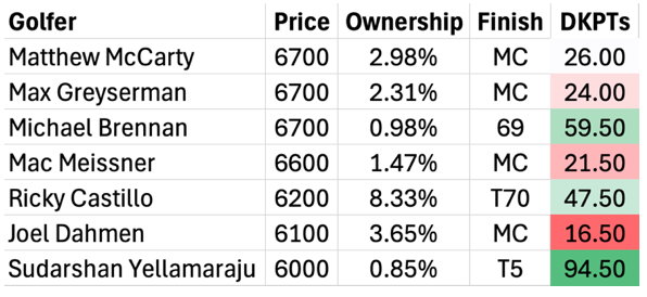 Well, it was a polarizing week for the Value Report on both ends of the spectrum, as there was relevance for just one of the eight picks; however, that one ended up being the best value play of the slate. Sudarshan Yellamaraju continued his breakout rookie season with a T5 at less than 1% ownership, which landed him as the only player priced below $7K inside the top 10. A truly remarkable performance from Yella, as he simply impresses every time he tees it up right now. Ricky Castillo did get off to a fast start and made it seem like Scottie Scheffler pairings were in a live spot early, but he flamed out quickly. While Michael Brennan showed his scoring upside, way too many bogeys made his week forgettable. Then the laundry list of missed cuts followed the rest of the list. Max Greyserman was likely the most disappointing, as he was -5 on his opening nine holes, pacing the field, until falling apart. But all in all, it was a tough week for the overall list.