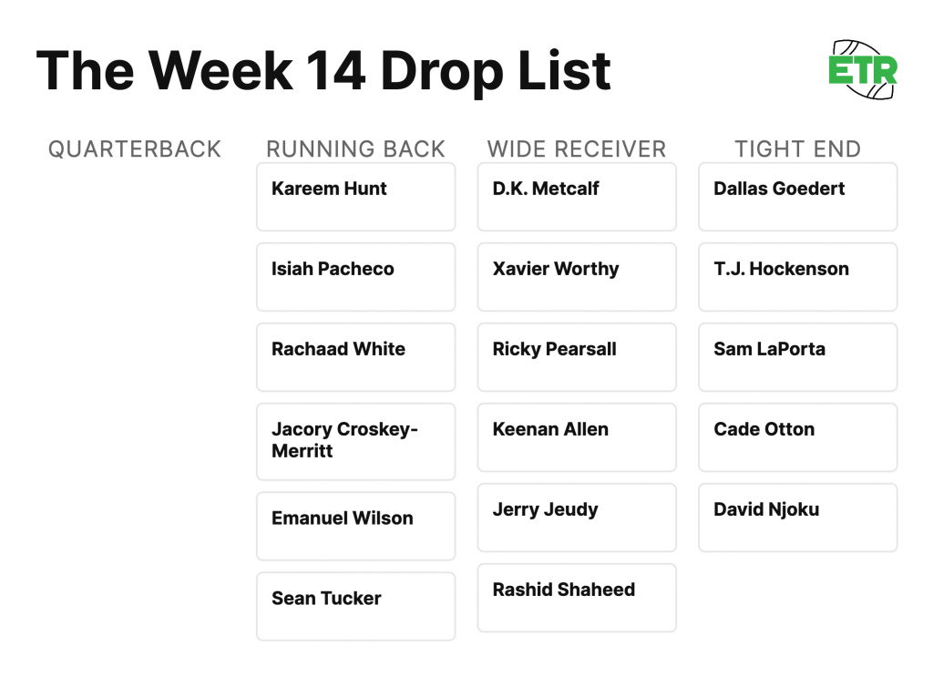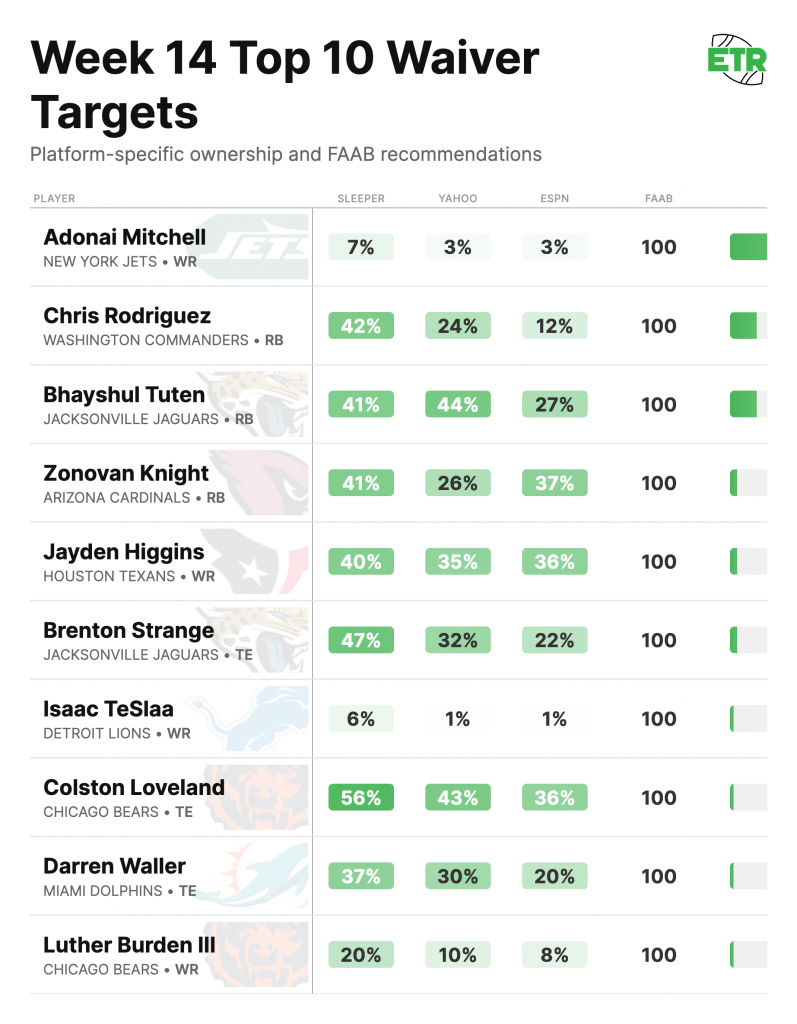 For those looking to roster the best available player(s) regardless of position, the rankings above weigh every position minus the players’ actual positions for all formats. These are listed in the precise order I would prioritize waiver claims in those leagues for Week 14. Adjust for what you need on your roster — immediate touches, high-upside bench stashes, targets, one-week spot starters, etc.