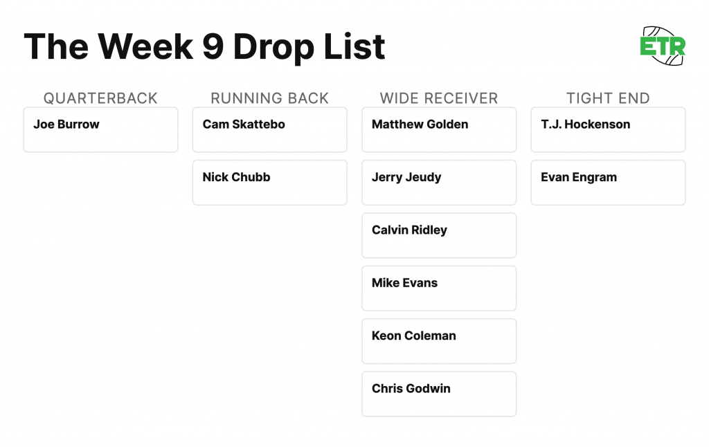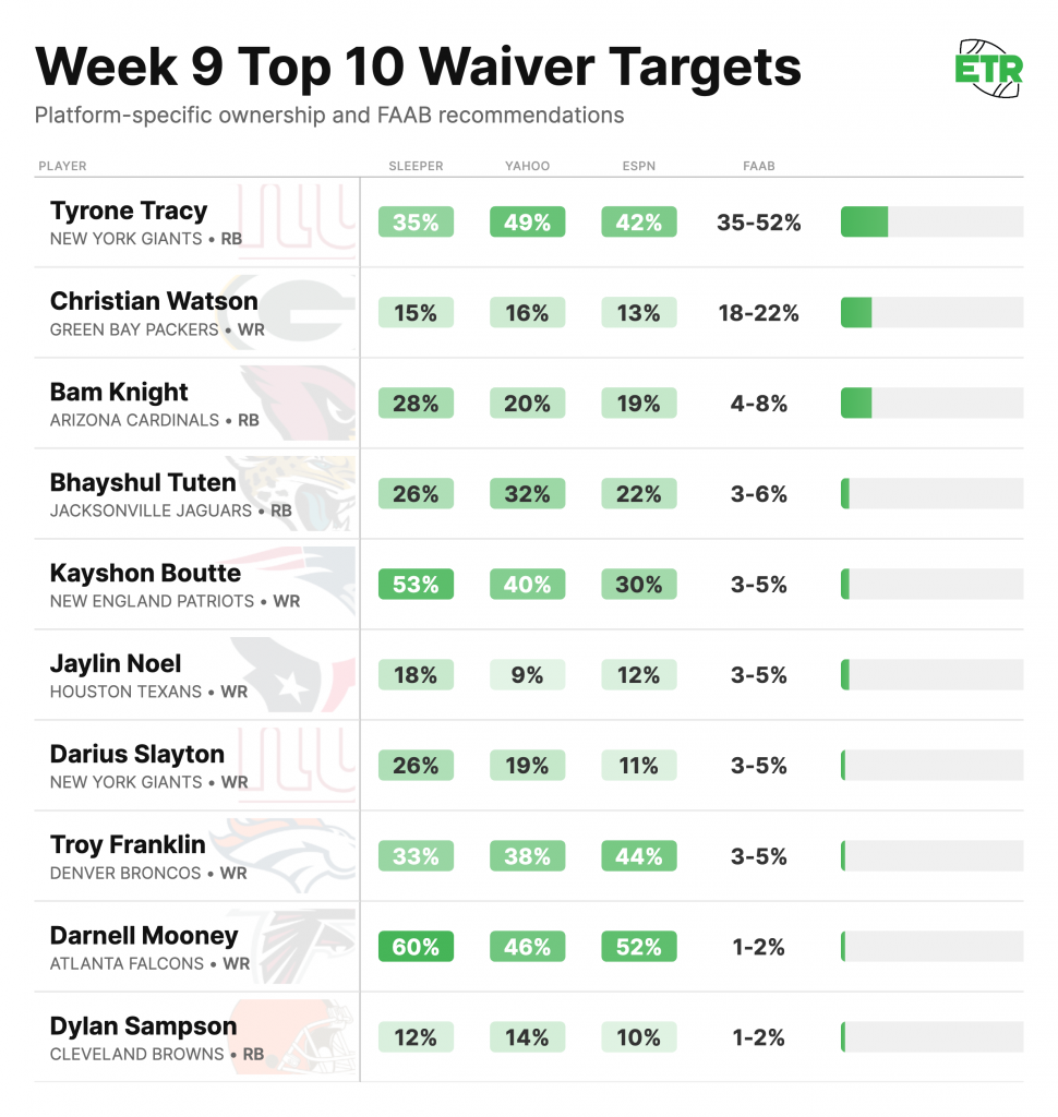 For those looking to roster the best available player(s) regardless of position, the rankings above weigh every position minus the players’ actual positions for all formats. These are listed in the precise order I would prioritize waiver claims in those leagues for Week 9. Adjust for what you need on your roster — immediate touches, high-upside bench stashes, targets, one-week spot starters, etc.